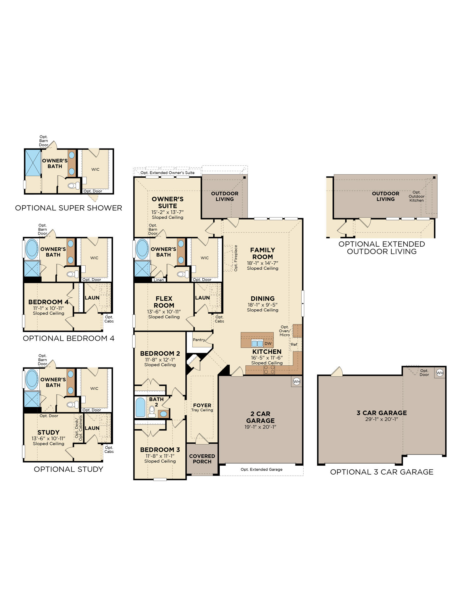 Extended Outdoor Living with BBQ Grill. Large Master Bathroom Super Shower. Three-car garage.
